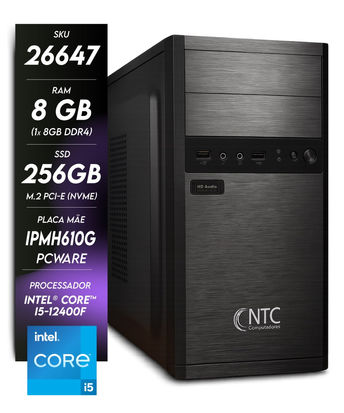O Computador NTC Select Intel - 1024 PW, vem equipado com processador Intel Core i5 12400F de 12ª Geração com 6 Núcleos e 12 Threads de 2.5Ghz a 4.4Ghz no modo Turbo, Placa Mãe Pcware IPMH610G, 8GB de Memória RAM DDR4 3000Mhz (1x8GB), SSD M.2 PCI-e de 256GB (NVMe), Fonte de alimentação de 300W Reais, Placa de Vídeo Dedicada Nvidia Geforce G210 de 1GB e Sistema Operacional Linux 64 Bits.