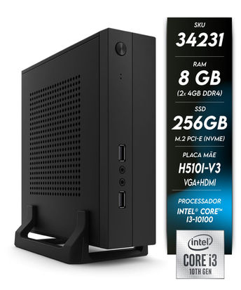 Montado sobre a placa mãe NTC H510I-V3, este minicomputador aproveita cada centímetro de seu gabinete de 2L. Seu design discreto permite que ele desapareça no ambiente de trabalho, podendo ser colocado em prateleiras, balcões de atendimento ou mesas pequenas, mantendo a estética limpa.